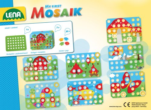 Mozaika pre najmenších, veľkosť kolíčka 33 mm, priemer hlavy 20 mm, 36 kolíčkov a 7 farebných šablón (predloha na umiestňovanie kolíčkov). Farebné klobúčiky, ktoré sa skadajú na podkladovú dosku s predtišneným motívom, dokážu vytvoriť nádherné obrázky. Vďaka veľkým dieram a kolieskam nebudú mať ani tí najmenší problém s umiestňovaním. Rozmery balenia 33 x 24 x 4 cm. Vhodné pre deti od 2 rokov.
