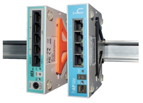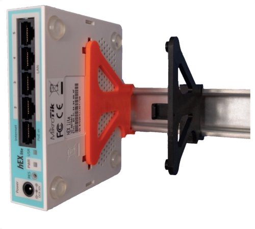 Plastový držiak na DIN lištu umožňujúci vertikálne uchytenie Mikrotik aktívnych prvkov série hAP a hEX v racku.