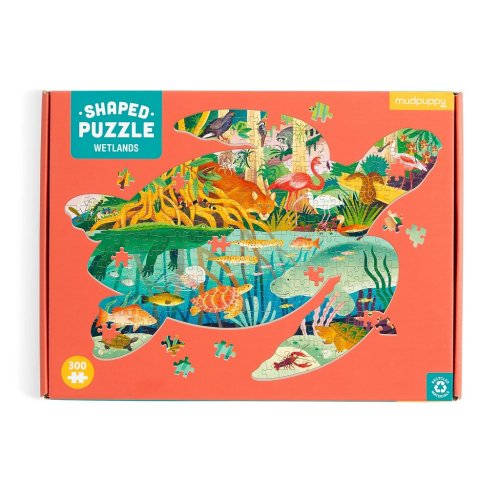 Puzzle Mokrade v tvare korytnačky od Mudpuppy obsahuje 300 dielikov a má jasnú a farebnú scénu vašich obľúbených zvierat nájdených v mokradiach, vrátane aligátora, pantera, vážok a mnohých ďalších. Hotové puzzle má tvar korytnačky. Puzzle je balené v pevnej krabici, na opätovné použitie a skladovanie. Ideálne ako darček. Autor obrázku je Kaley McKean. Puzzle sú vyrobené za použitia významného podielu recyklovaného papiera a ponúkajú špičkovú potlač nezávadnými farbami. Sú opatrené matnou povrchovou úpravou, ktorá zaisťuje za všetkých okolností verné podanie detailov i farieb. Ich zadná strana je potiahnutá hladkým, na dotyk príjemným povrchom, vďaka ktorému sa pri skladovaní rozloženého puzzle netvorí prach. Spolu so starostlivo zabalenými dielikmi nájdete v balení aj letáčik s návodným obrázkom, ktorý spravidla obsahuje ďalšie informácie o tvorcoch a pozadí vzniku diela. Dodávané v mimoriadne pevnej a pútavo spracovanej kartónovej krabičke vyrobenej z recyklovaného kartónu. Hlavné vlastnosti: 300 precízne vyrezaných dielikov vyrobených s použitím recyklovaných a udržateľne získaných materiálov starostlivo vybraný motív od renomovaných tvorcov a umelcov potlač a prevedenie najvyššej kvality obsahuje návodný obrázok