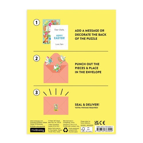 12dielne puzzle s jarným sprievodom vo veľkosti pohľadnice. Kúzelná ilustrácia sviatkov jari na jednej strane a na strane druhej priestor na napísanie Vášho veľkoničného blahoželania. Puzzle je dodávané v zloženej forme. Súčasťou je aj farebne zladená obálka a samolepiaca fólia. Chcete potešiť svojich blízkych netradičnou pohľadnicou a popriať im k Veľkej noci? Potom je toto puzzle presne pre vás! Napíšte svoje blahoželanie na zadnú stranu tohto puzzle, potom ho rozoberte, vložte jednotlivé dieliky do priloženej obálky a potom už len pošlite. Vari asi povie obdarovaný, keď si puzzle zloží a prečíta si Váš odkaz? Hlavné vlastnosti: 12dielne puzzlezaujímavé prianie vo veľkosti pohľadnice vrátane obálky a samolepiacej fólie