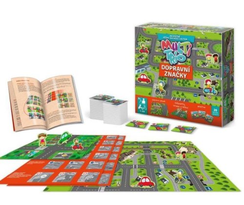 Multi-TRIO Dopravné značky je veľký súbor hier na spoznávanie základných dopravných značiek a dopravných situácií. Slúži ako vhodný doplnok obľúbeného predmetu Dopravná výchova, prenesený do hravej formy stolnej hry. Súprava okrem iného obsahuje podklady pre testy 20 dopravných situácií, ktoré sa deti musia učiť už v ranom veku ako chodci alebo cyklisti. Ďalší z herných variantov sú založené na hľadaní dvojíc či trojíc kartičiek, tak ako to poznáte z iných hier českej značky Pexetrio. A čo vás tu čaká napríklad za herné varianty? Pre vek 4–5 rokov: herné varianty pre prvé zoznamovanie sa s dopravnými značkami (hra LOTO-TRIO a herné varianty hry Pexetrio) pre vek 5–7 rokov: herné varianty pre prvé cestovanie na pláne pomocou dopravných značiek a priložených figúrok pre vek 6 –8 rokov: herné varianty pre dopravné testy a ich vyhodnocovanie, opäť pomocou figúrok a plánikov križovatiek Charakteristika doskovky. Hra je odporúčaná od 4 rokov, kedy sa deti aktívne zaujímajú o dopravu okolo nich. Avšak jednoduchšie varianty hier (napríklad LOTO-TRIO, stavanie figúrok na dopravný plánik a rozprávanie sa o tom) zvládnuť už aj 3 ročné deti. Niektoré z hier sú vhodné pre jedného hráča, ďalšie si zahrá skupina až 6 hráčov. S Multi-triom Dopravné značky neurobíte chybu ani v škôlke, školskej družine či na hodinách prvouky. Každá z hier trvá rôznu dobu a záleží len na deťoch, ako dlho sú ochotné sa ich hrať. Vďaka veľkému množstvu herných variantov táto sada len tak neomrzí. Sada obsahuje72 kartičiek = 24 dopravných značiek - trojíc: 1. obrázok = dopravná značka, 2. obrázok = situácia pri dodržaní pravidiel, 3. obrázok = porušenie pravidiel, ktoré dopravná značka predpisuje.8 figúrok chodcov, cyklistov a motorových vozidiel herný plán Dopravného ihrisko na testovanie rôznych dopravných situácií (66 x 46 cm) 4 ks herných plánov pre herné varianty LOTO trio 8 ks herných plánov križovatiek pre Dopravné testy podrobný návod na všetky varianty prehľad 24 dopravných značiek, ich presné názvy, kódové označenie, doslovné znenie pravidiel, ktoré dopravné značky predpisujú