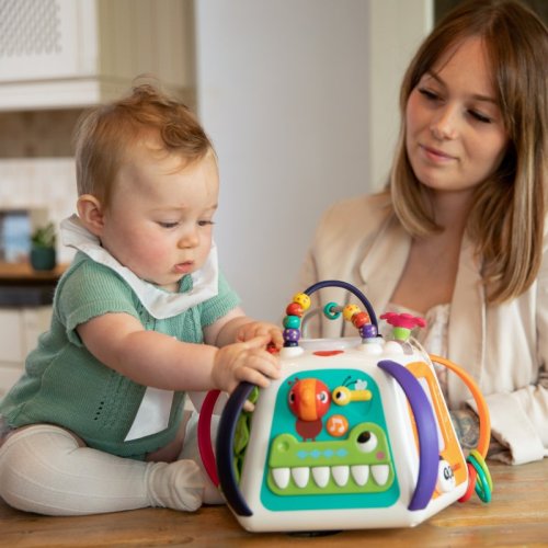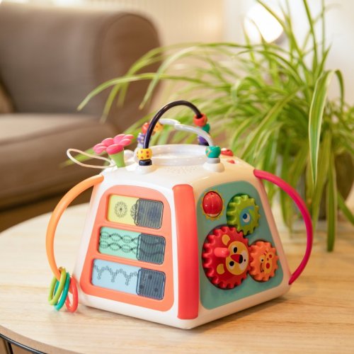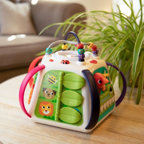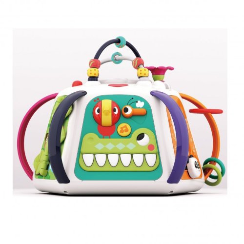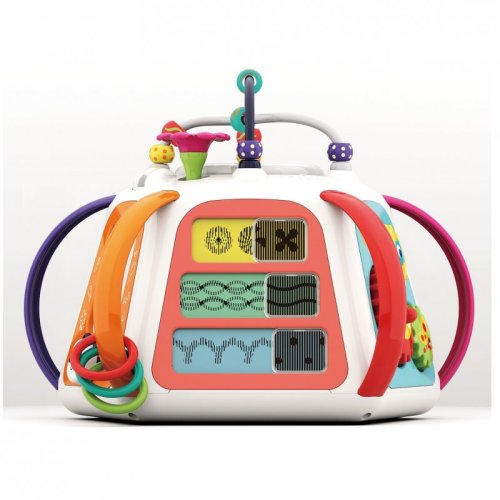 • plastová pyramída s mnohými aktivitami - labyrint s korálkami, zrkadlo, kresliaca tabuľka, ozubené kolieska, úchyty s LED osvetlením, hudobné tlačidlá, rotujúci valček s farebnými guličkami, pohyblivé vzory, hra so zvieratkami ai.