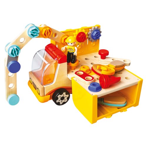 Multifunkčné nákladné auto s odklápacou korbou, figúrkou vodiča, množstvom stavebnicových dielov a náradím. Autíčko vďaka príslušenstvu ponúka priestor na realizáciu rôznych stavieb, a pomáha tak rozvíjať predstavivosť a jemnú motoriku. Ponúka robustné prevedenie, odolnosť aj nízku hmotnosť, všetko vďaka kombinácii silnej preglejky a plastu. Hlavné vlastnosti: auto, figúrka, kľúč, kladivko, skrutkovač a 25 stavebnicových dielov