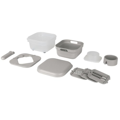 Tento multifunkčný krájač v elegantnej krémovej farbe je ideálnym riešením pre rýchle a efektívne krájanie rôznych druhov potravín Vďaka trom vymeniteľným čepeliam z nerezovej ocele umožňuje ľahké krájanie podľa potreby, a zároveň slúži aj ako úložná nádoba.
