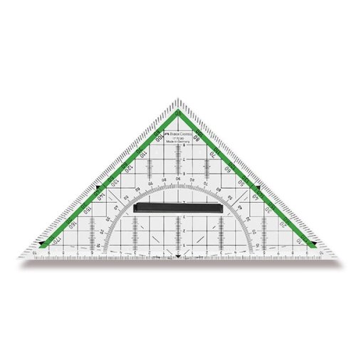 Technický trojuholník na rysovanie a technické kreslenie uľahčuje meranie priamok, kolmíc, uhlov, rovnobežiek a axonometrické kreslenie. Milimetrová stupnica na prepone, vždy 10 cm, od stredu na obe strany s označením celého centimetra číslicou. Uhlomerová stupnica 0-180° na odvesniach a oblúková uhlomerná stupnica 0 – 90° uprostred prepony na obe strany., Stupnica s delením po jednom stupni a označením každého desiateho stupňa číslicou. Priečne milimetrové stupnice kolmé na preponu umožňujúce kreslenie rovnobežiek s označením, každého piateho milimetra číslic.