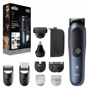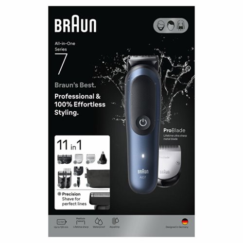 Profesionálna sada pre kompletnú starostlivosť o telo, vlasy a fúzy. Braun Series 7 AIO7540 ponúka až 11 funkcií v jednom zariadení a umožňuje rýchle, presné a šetrné zastrihnutie alebo oholenie od hlavy až po päty. Vďaka vodeodolnému prevedeniu a výkonnej batérii je ideálny aj na použitie v sprche.