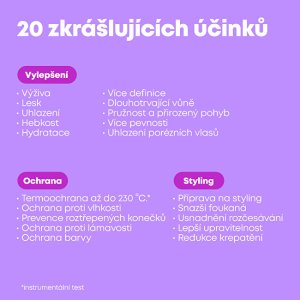 Všestranný bezoplachový sprej, ktorý ponúka 20 účinkov pre viditeľne zdravšie a krajšie vlasy. Ľahká receptúra je obohatená o aktívne látky, ktoré spoločne dodávajú vlasom lesk, hebkosť, kontrolu nad krepatením a mnoho ďalších benefitov.