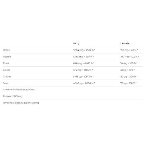 Veľmi účinná kapsulová forma dôležitých minerálov v chelátovej podobe. Ide o skvelý doplnok stravy a súčasne je to aj pomocník na dodržanie vyváženého jedálnička nielen aktívnych športovcov. Z minerálov sú tu zastúpené horčík, vápnik, zinok, železo, chróm a selén. Vápnik je potrebný na udržanie normálneho stavu kostí a na pravidelnú činnosť srdca. Horčík prispieva k zníženiu miery únavy a vyčerpania ak normálnej činnosti nervovej sústavy. Zinok napomáha k pravidelnému metabolizmu sacharidov, mastných kyselín a hlavne k syntéze bielkovín. Železo prispieva k tvorbe červených krviniek, hemoglobínu ak prenosu kyslíka. Chróm prispieva k udržaniu hladiny glukózy v tele. Selén prispieva k ochrane buniek pred oxidačným stresom. 1 balenie = 60 tabliet Obsiahnuté látky: Horčík - chelátová forma, Vápnik - chelátová forma, Železo - chelátová forma, Zinok - chelátová forma, Chróm, Selén. Určený pre: - zaťažovaný organizmus a pre harmonizáciu tela Odporúčané dávkovanie: užívajte 1 kapsulu denne. Maximálna denná dávka je 1 kapsula. Neprekračujte odporúčané dávkovanie. Použitie: podľa odporúčaného dávkovania prehltnite kapsule a zapite dostatočným množstvom vody. Nie sú vhodné alkoholické a mliečne nápoje. Kapsulu nehryzte! Zloženie: Bisglycinát vápenatý, bisglycinát horečnatý, uhličitan horečnatý, želatínová kapsula (želatína, farbivo oxid železa), uhličitan vápenatý, oxid horečnatý, mliečnan chromitý, L-OptiZinc zinočnatý), plnidlo stearan horečnatý, organicky viazaný selén z kvasiniek, bisglycinát železnatý, protispekavá látka oxid kremičitý. L-OptiZinc® je registrovanou ochrannou známkou InterHealth NI . Upozornenie: - Výživový doplnok Nenahrádza pestrú stravu. - Nie je určené pre deti, tehotné a dojčiace ženy. - Ukladajte mimo dosahu detí! Skladujte v suchu pri teplote do 25 ° C mimo dosahu priameho slnečného žiarenia. Chráňte pred mrazom. - Výrobca neručí za prípadné škody vzniknuté nevhodným použitím alebo skladovaním. Dodávateľ: NUTREND DS ., as ., Chválkovice 604, 779 00 Olomouc, Česká republika