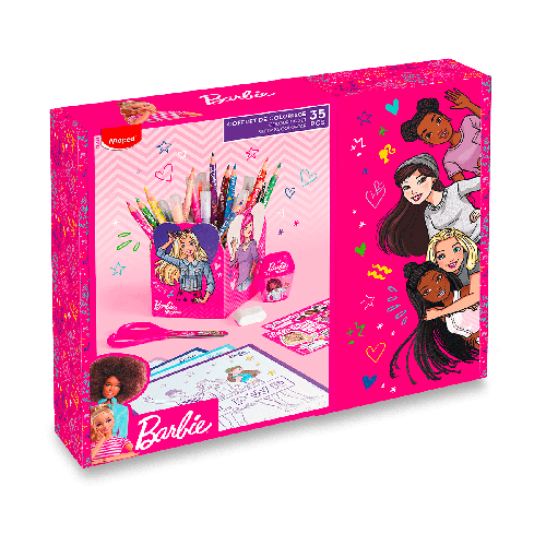 Súprava obsahuje:, * 12 ks pasteliek Barbie, * 12 ks fixiek Barbie, * plastové strúhadlo Shaker Barbie, * nožnice Pulse 13 cm Barbie, * guma Barbie, * 2 ks hárkov samolepiacich etikiet Barbie, * 5 ks omaľovánok Barbie a * skladací stojanček na pastierok
