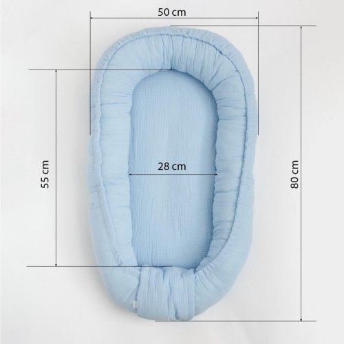 Mušelínové hniezdočko New Baby je vyrobené z prvotriednej bavlnenej priadze. Umožňuje umiestniť dieťa do pohodlnej polohy a hlavne môže byť dieťa umiestnené v kokone stále v blízkosti mamičky. Pri cestovaní si môžete vziať hniezdočko so sebou, aby dieťa pripútané k vôni domova a svojmu miestu mohlo bezstarostne spať na inom mieste. Hniezdočko môžete umiestniť do postieľky, na pohovku, na zemi aj do kočíka. Dieťa v ňom môže spať, odpočívať alebo sa hrať. Hniezdočko bude veľkým pomocníkom vo vašej domácnosti. Určené pre bábätká od 0-12 mesiacov.