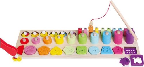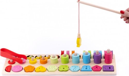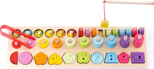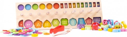 10 drevených tvarov 10 drevených číslic 6 včeličiek z dreva 10 drevených rybičiek s magnetom 1 drevená udica s magnetom 1 plastová pinzeta 55 drevených krúžkov