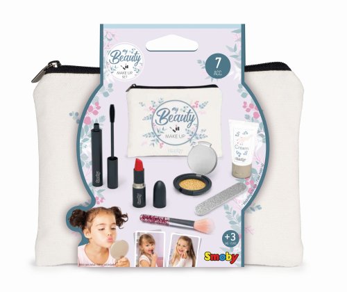 Kozmetická taštička Smoby My Beauty Make Up s rúžom, riasenkou, očnými tieňmi, štetcom, glitrovým pilníkom, krémom na ruky. Atrapy kozmetiky. Rozmery taštičky: 17,5 x 13,5 cm.