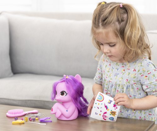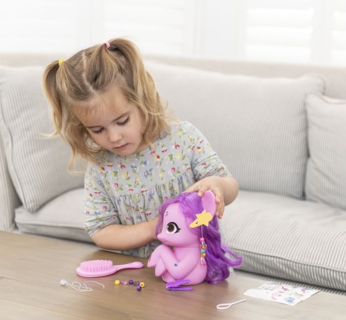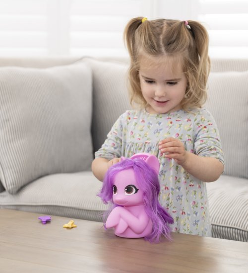 Vytvorte nekonečné a vzrušujúce účesy s princeznou Pipp Petals z My Little Pony! Doplňte a upravte Pippovu krásnu dlhú hrivu fialových vlasov radom kúskov My Little Pony. Môžete si dokonca vytvoriť svoje vlastné korálkové náhrdelníky! Táto stylingová hlava obsahuje kefu na vlasy, korálky, navliekač korálok a niť, spolu s gumičkami do vlasov, sponkami do vlasov a aršíkom s nálepkami s motívom Pippy, vrátane jej roztomilého znamienka! Všetky doplnky, ktoré potrebujete na zábavu pri úprave vlasov! Vhodné od 3 rokov.