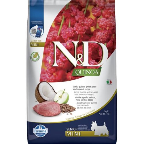 Kompletné bezobilné (grain-free) granule pre staršie psy malých plemien. Hlavným zdrojom vysoko kvalitných bielkovín v krmive je hypoalergénne jahňa. Pridaná superpotravina quinoa obsahuje cca 13% bielkovín s vysokou biologickou hodnotou a všetky esenciálne aminokyseliny vo vyváženom pomere (vo svete rastlín veľmi vzácne). Rybí olej zaručuje optimálny pomer omega-3 a omega-6 mastných kyselín pre dobrú kondíciu kože a srsti a ich regeneračnú schopnosť. Zelené jablko podporuje trávenie a dodáva prírodné antioxidanty. Krmivo neobsahuje obilniny, geneticky modifikované suroviny, umelé farbivá, bielkoviny zo sóje ani hormonálne alebo antibiotické rezíduá. Zloženie: jahňa (20 %), dehydrovaný proteín z jahňaťa (18 %), hrachový škrob, kurací tuk, vláknina z hrachu, quinoa semienka (8 %), sušené vajcia, ľanové semienko, dehydrovaný proteín zo sleďa, rybí olej (zo sleďa5), suše (2,5 %), karob, alfalfa múčka, inulín (0,6 %), fruktooligosacharidy (0,6 %), extrakt z kvasníc (zdroj mannanoligosacharidov) (0,6 %), semená a šupky psyllia, chlorid draselný, dihydrát síranu vápenat, chondroitín sulfát. Analytické zložky: hrubý proteín 27 %, hrubý tuk 15 %, hrubá vláknina 6,5 %, vlhkosť 9 %, hrubý popol 7,7 %, vápnik 1 %, fosfor 0,7 %, draslík 0,65 %, sodík 0,3 %, horčík 0,02 %, o mastné kyseliny 0,45 %, DHA 0,15 %, EPA 0,1 %, glukosamín 1 200 mg/kg, chondroitín sulfát 1 000 mg/kg. Doplnkové látky na 1 kg: Nutričné: vitamín A 15 000 MJ, vitamín D 3 1 500 MJ, vitamín E 600 mg, vitamín C 150 mg, niacín 37,5 mg, vápnik D-pantothenát 15 mg, vitamín B 2 7 4,5 mg, biotín 0,38 mg, kyselina listová 0,45 mg, vitamín B 12 0,1 mg, cholín chlorid 3 000 mg, beta-karotén 2 mg, zinok (chelát zinku hydroxy analógu metionínu) 163,8 mg, mangán (chelát mg, železo (chelátová forma železa(ii), hydrát): 58,3 mg, meď (chelát medi hydroxy analógu metionínu): 5,4 mg, selén (inaktivované kvasinky obohatené selénom) 0,1496 mg, jód (jodičnan vápenatý bezvodý čistý 5 000 mg, taurín 2 000 mg, L-lyzín-onohydrochlorid, technicky čistý 2 000 mg, L-tryptofán 2 000 mg, L-karnitín 650 mg. Technologické: mikrokryštalická celulóza. Senzorické: extrakt zo zeleného čaju 100 mg, extrakt z rozmarínu. Antioxidanty: extrakty tokoferolu z rastlinných olejov. Dávkovanie: