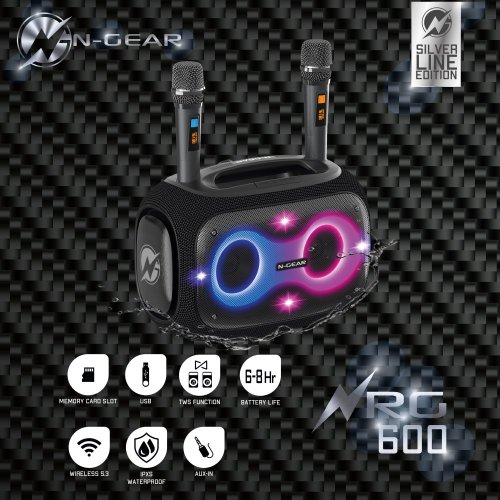 Vďaka tomu reproduktor N-GEAR NRG 600 prepojíte napríklad so smartfónom alebo tabletom a môžete jednoducho streamovať hudbu zo svojho zariadenia. Nechýba ani podpora prehrávania z USB úložiska alebo MicroSD kariet . Súčasťou balenia je dvojica bezdrôtových mikrofónov , tak sa pripravte aj na večerné karaoke. Poteší tiež podpora funkcie TWS (True Wireless Audio), ktorá vám umožní prepojenie dvojice reproduktorov a vytvorenie skutočného stereo ozvučenia. Zabudovaná batéria s kapacitou 18 000 mAh podporuje až 8 hodín prevádzky , takže žiadna párty neutíchne predčasne.
