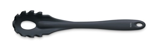 Z praktického radu kuchynských potrieb Tom: Lyžica na špagety zo silikónu v čiernej farbe s praktickou, skôr plochou rukoväťou a celkovou dĺžkou 28,5 cm. Veľkorysé pútko na zavesenie je ideálne, pokiaľ nie je potrebný zdvihák cestovín. Silikón čierny, 28,5 x 5,5 cm