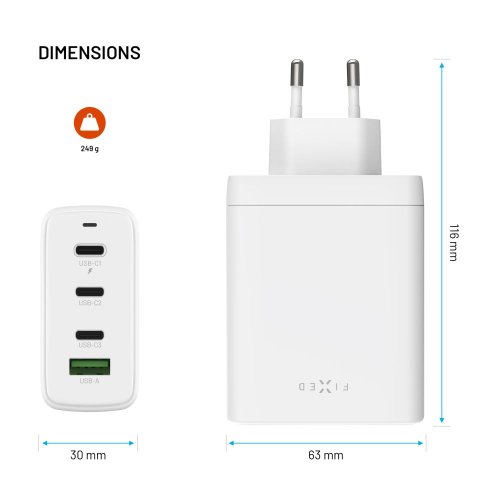 Univerzálna sieťová nabíjačka FIXED GaN s výkonom 120 W nabije až 4 zariadenia súčasne a vďaka modernej GaN technológii zostáva kompaktná a efektívna. Hlavný port USB-C1 s PD 3.0 zvládne aj výkonné notebooky.