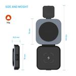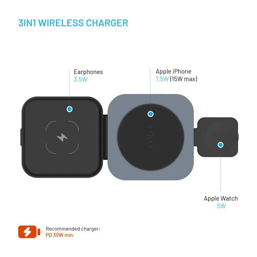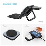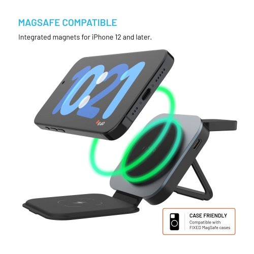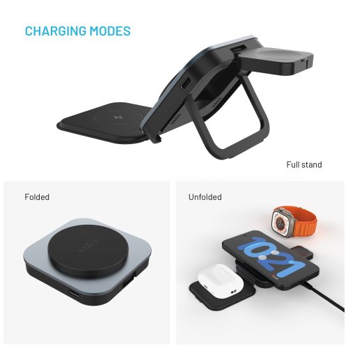 Po rozložení získate hlavnú nabíjaciu plochu s podporou MagSafe, kde nabijete váš iPhone radu 12 a vyšší s výkonom max. 7,5 W. Smartphony iných značiek nabíjate s výkonom max. 15 W. Výklopná plocha je špeciálne vyhradená pre nabíjanie Apple Watch hodiniek . slúchadlá . Na stav nabitia vás upozorní LED indikátor.