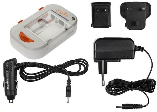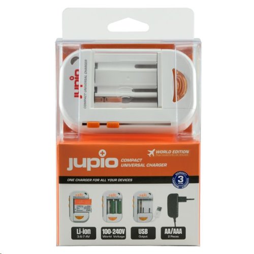 Kompaktná univerzálna nabíjačka Jupio LUC0050 pre ceruzkové (AA) a mikrotužkové (AAA) batérie a lítium-polymérové a lítium-iónové batérie pre fotoaparáty a videokamery s napätím 4,2 až 8,4 V.