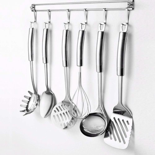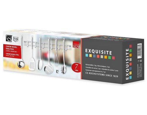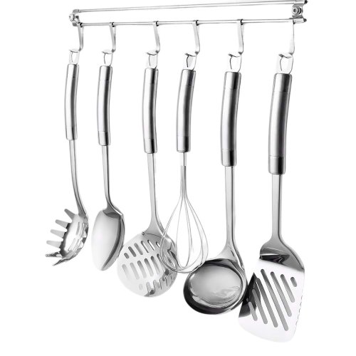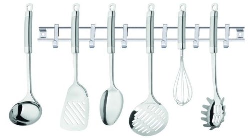 -Materiál: nerezová oceľ/chróm/nikel-farba: strieborná-kombinácia matného a lešteného povrchu-sada obsahuje:-naberačka, naberačka na špagety-servírovacia lyžica, šľahacia metla-penovačka, obracačka -dĺžka lišty: 40cm