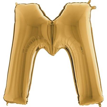 Zlatý balónik písmeno M. Balónik je vyrobený z pevnej fólie.
