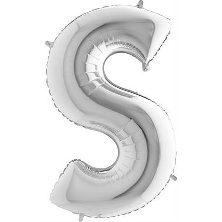 Strieborný balónik písmeno S. Balónik je vyrobený z pevnej fólie.