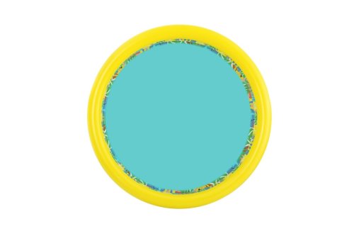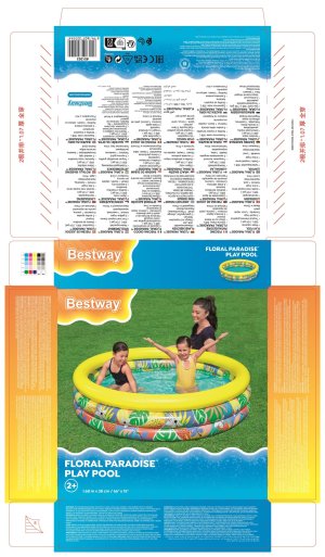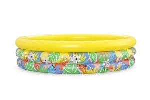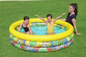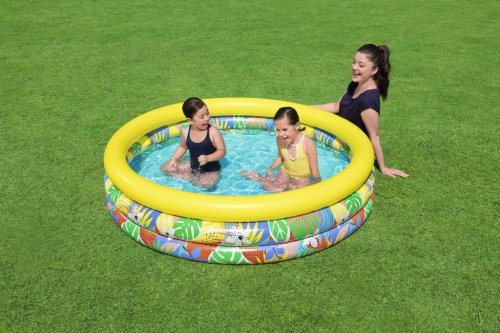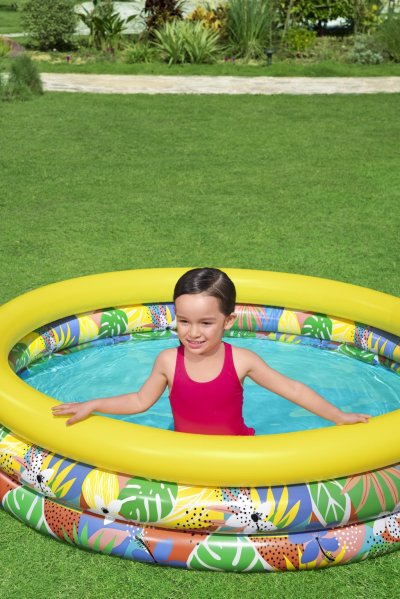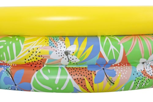 Bazén je vyrobený z odolného PVC materiálu, ktorý zaisťuje pevnosť a dlhú životnosť. Konštrukcia pozostáva z troch nafukovacích komôr, ktoré sú vybavené bezpečnostnými ventilmi pre ľahké a bezpečné nafúknutie aj vyfúknutie. Dizajn bazéna je výrazný a veselý, s tropickým motívom listov a kvetov v jasných farbách - zelená, modrá, žltá a oranžová - ktoré prinášajú do každého dvora atmosféru tropického raja. Vrchný prstenec je žltý, čo kontrastuje s farebným vzorom spodných dvoch prstencov a zaisťuje stabilitu a pevnosť celej konštrukcie.
