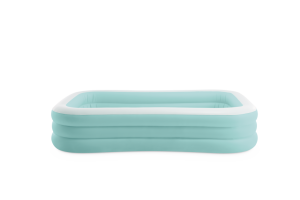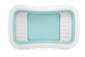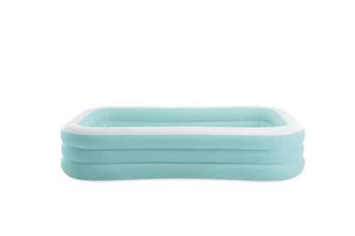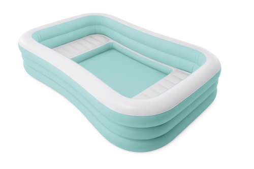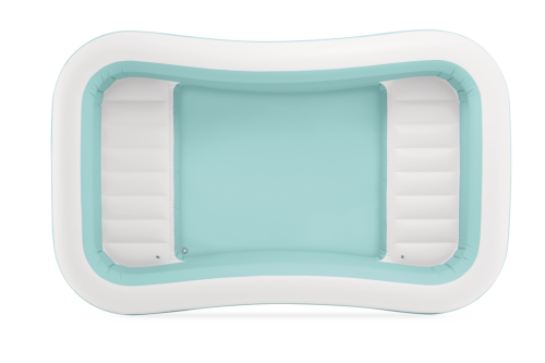Nafukovací bazén Swim Center Family Lounge je navrhnutý pre pohodlný rodinný odpočinok a zábavu vo vonkajšom prostredí. Bazén má obdĺžnikový tvar s mierne zaoblenými rohmi a je vyrobený z pevného, hladkého PVC materiálu v kombinácii svetlo modrej a bielej farby, čo mu dodáva svieži a príjemný vzhľad. Jeho konštrukcia je tvorená tromi nafukovacími kruhmi, ktoré zaisťujú stabilitu a dostatočnú výšku stien bazéna.