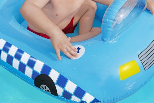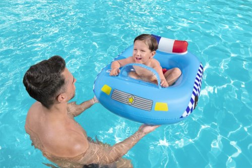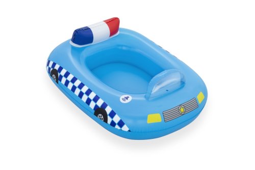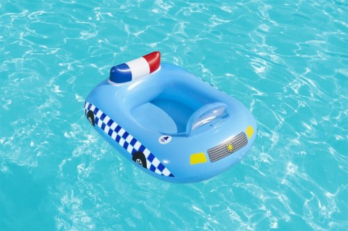 Nafukovací čln v dizajne policajného auta o veľkosti 97×74 cm pre deti od 3 rokov. Zabudovaný zvuk sirény, batérie nemožno vymeniť.