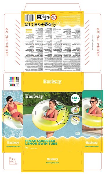 Bestway® Nafukovací kruh Fresh Squeezed™ Lemon umožní malým aj väčším plavcom užiť si zábavu vo vode. Vyrobený je z veľmi kvalitného a odolného PVC materiálu a disponuje priemerom 114 cm. Plávací kruh Bestway je ideálnym doplnkom pre vodné aktivity detí i dospelých. Stačí si do neho sadnúť a nechať sa unášať vodou. Kruh má jednu vzduchovú komoru, poistné ventily a dve madlá. Vrátane opravnej záplaty. Nafúknutá veľkosť kruhu: Ø 99 x 31,5 cm. Nenafúknutá veľkosť kruhu: Ø 114. Rozmery balenia: 19,8 x 19,8 x 6,5 cm. Určené pre 1 osobu. Maximálna nosnosť: 100 kg. Vek: 12+