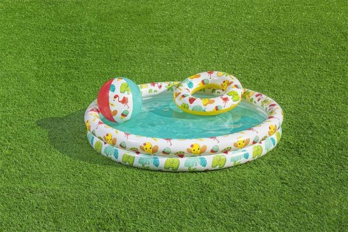 Nafukovací set s bazénikom Bestway® Beachtastic™. Užite si veľa zábavy a príjemného osvieženia v horúcich letných dňoch s Bestway sadou – bazén, lopta a plávací kruh v pestrofarebnom tropickom dizajne. Vyrobené z kvalitného a odolného PVC. Bazén má 2 vzduchové komory. Bezpečnostné ventily. Obsahuje: 1 bazén, 1 loptu, 1 plávací kruh, 1 opravnú súpravu. Max kapacita: 137 l. Nafúknutá veľkosť bazéna: Ø 122 x 20 cm. Nenafúknutá veľkosť bazéna: 112 x 112 cm. Rozmer nafúknutej lopty: Ø 27 cm (rozmer vyfúknutej lopty: 41 x 15 cm). Rozmer nafúknutého kruhu: Ø 46 x 11 cm (rozmer vyfúknutého kruhu: Ø 51 cm). Rozmery balenia: 19,8 x 19,8 x 6 cm. Používajte iba pod dohľadom dospelej osoby. Vek: 2+