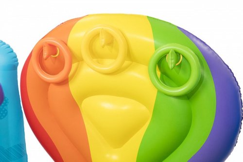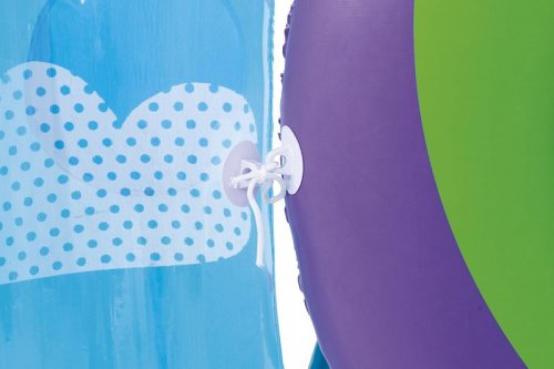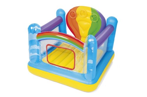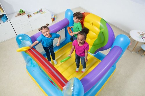 Nafukovací hrad skákací vo veselých dúhových farbách. Veľkosť hradu je približne 1,75 mx 1,73 mx 1,37 m. Hrad môžete použiť ako doma, tak vonku. 3 nafukovacie krúžky súčasťou balenia. Opravná záplata súčasťou balenia.
