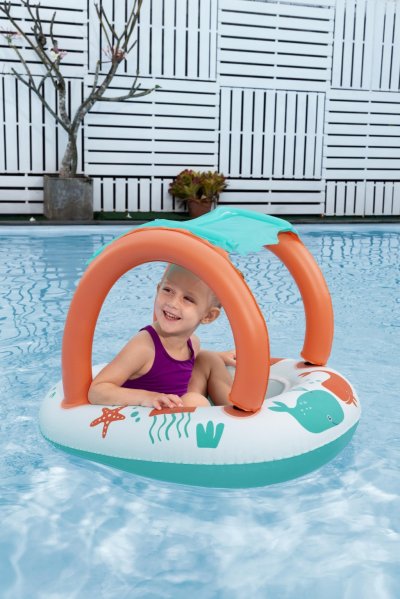 Nafukovacia loďka so strieškou je navrhnutá špeciálne pre deti od troch rokov s maximálnou hmotnosťou do 30 kg. Tento detský čln ponúka bezpečný a pohodlný spôsob, ako si najmenší môžu užiť pobyt vo vode. Loďka je vyrobená z hladkého zamatového materiálu Comfort Plush, ktorý je príjemný na dotyk a zaisťuje deťom maximálny komfort počas plávania. Farby na člne sú v pastelových tónoch – oranžová, tyrkysová a biela – as motívmi morských živočíchov ako sú veľryby a hviezdice, ktoré loďke dodávajú hravý a priateľský vzhľad.