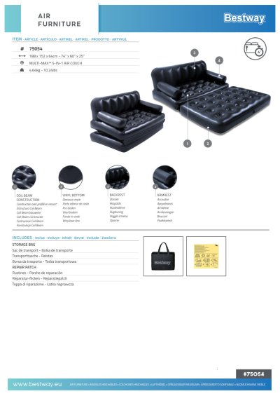Nafukovacia pohovka poslúži ako posteľ, relaxačná pohovka, luxusná sofa, pohodlné lôžko alebo vyvýšené lôžko. Lôžka sú pohodlné s trojkomorovým systémom a stabilnou konštrukciou, vhodné na každú príležitosť. Počas niekoľkých sekúnd vytvoríte množstvo užitočných kusov nábytku. 5 využiteľných polôh podľa vašej okamžitej potreby: