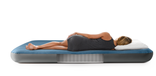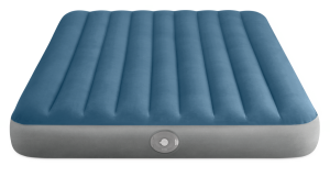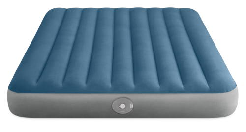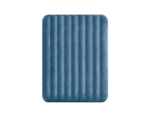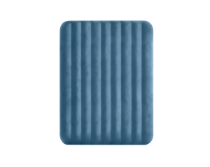 Posteľ má klasický tvar queen size a jej farebné prevedenie kombinuje modrý vrchný poťah so šedými bokmi, čo jej dodáva moderný a elegantný vzhľad. Nafukovacia časť je tvorená vodorovnými rebrami, ktoré prispievajú k rovnomernému rozloženiu vzduchu a stabilite počas spánku. Vďaka nízkej výške je posteľ ľahko prístupná a zároveň dostatočne pohodlná na bežné použitie. Na boku postele je umiestnený ventil 2v1, ktorý umožňuje rýchle nafúknutie aj vyfúknutie.