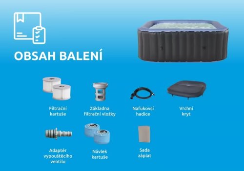 Poznámka: Pri poklese teploty vonku pod 4 °C je nutné pred nafúknutím nechať plášť vírivky aklimatizovať v teplej miestnosti po dobu 24 hod. Po nafúknutí je nutné ju ihneď napustiť vodou a zapnúť ohrev.