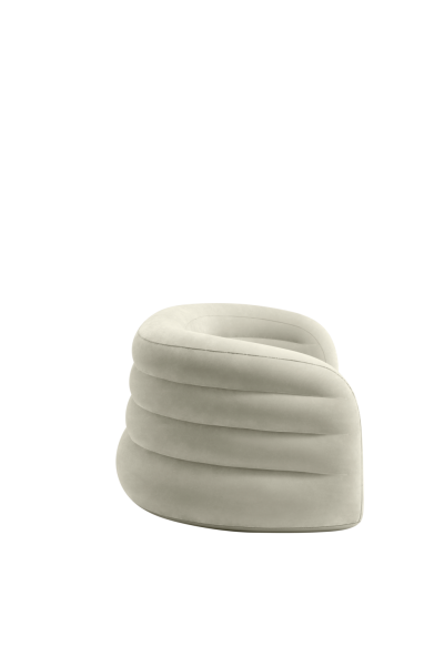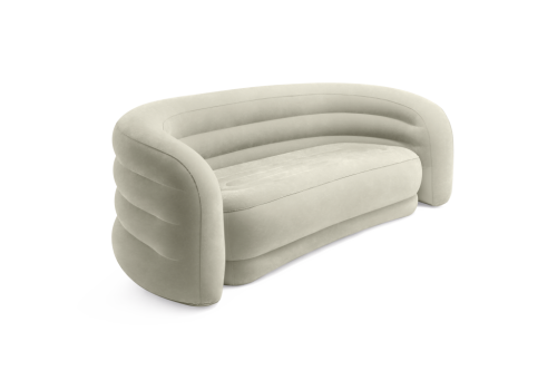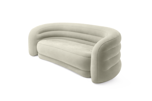 Nafukovacia zaoblená pohovka Curve predstavuje moderný a praktický doplnok do interiéru, ktorý kombinuje pohodlie s jednoduchosťou použitia. Jej dizajn je charakteristický zaoblenými tvarmi, ktoré dodávajú nábytku príjemný a organický vzhľad. Povrch pohovky je potiahnutý plyšovým zamatom v neutrálnej olivovo béžovej farbe, čo zaisťuje príjemný a mäkký dotyk, zároveň potom pôsobí elegantne a ľahko sa začlení do rôznych štýlov zariadenia miestnosti.