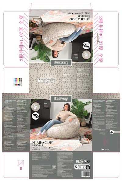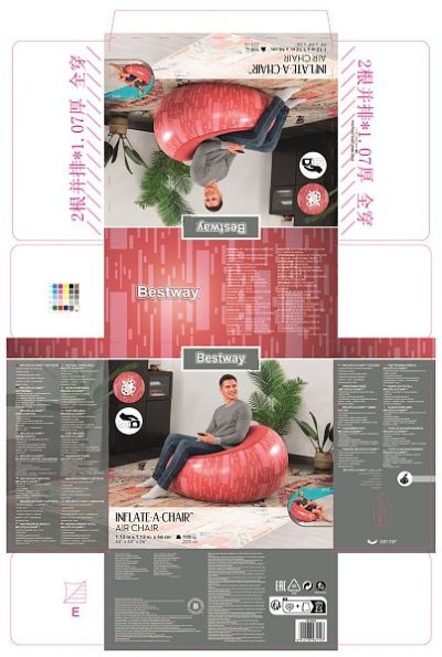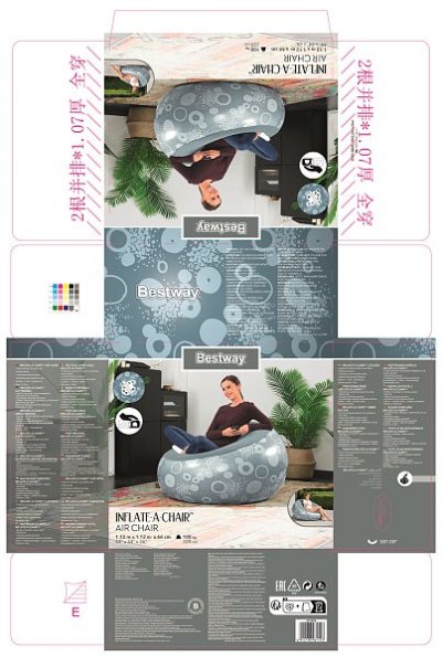 Nafukovacie kreslo Bestway® Inflate-A-Chair™ vďaka svojim jedinečným vlastnostiam určite splní očakávania aj tých najnáročnejších užívateľov. Kreslo má robustnú konštrukciu s dvoma vzduchovými komorami a je vyrobené z odolného PVC. Dvojcestný ventil s aretáciou pre rýchle a ľahké nafúknutie a vyfúknutie. Skvelý pre vnútorné aj vonkajšie použitie. Opravná záplata je súčasťou balenia. Kreslo je určené pre 1 osobu. Maximálna nosnosť 100 kg. Assort je náhodný mix modelov. Výber nie je možné ovplyvniť. 3 farebné designy so zamatovým povrchom na sedenie. Nafúknutý rozmer kresla: 66 x 112 x 112 cm. Rozmery balenia: 23 x 25 x 11 cm.
