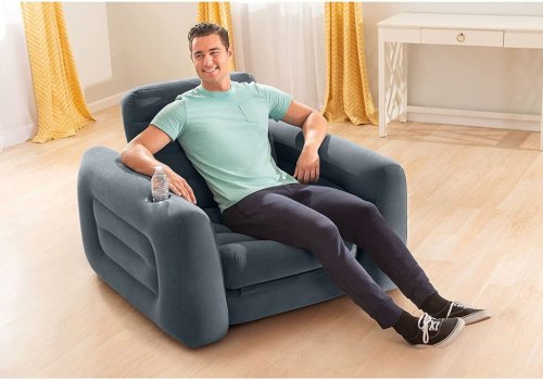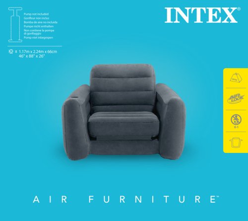 Nafukovacie kreslo o veľkosti 1,17 mx 2,24 mx 66 cm. Zabudovaný držiak na nápoje. Jednoduché nafukovanie a vyfukovanie. Len na vnútorné použitie.