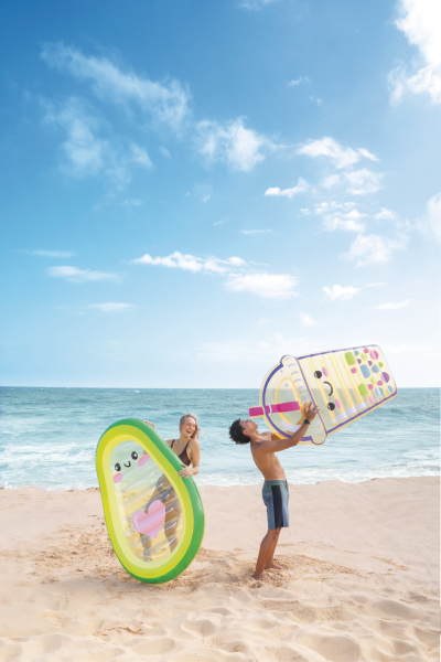 Nafukovacie lehátko v tvare bubble tea s názvom Boba Buddy predstavuje zábavný a originálny doplnok pre letné dni pri vode alebo na pláži. Lehátko je vyrobené z kvalitného PVC materiálu, ktorý je transparentný a farebne zladený tak, aby verne pripomínal obľúbený nápoj bubble tea. Celý dizajn dopĺňa veselú tvár s čiernymi očami a ružovými tvárami, ktorý lehátku dodáva hravý a priateľský výraz.
