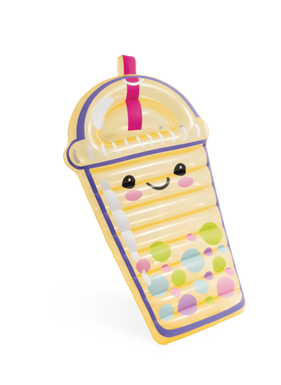 Tvar lehátka je charakteristický svojou podobou téglika na bubble tea, vrátane viečka a ružovej slamky, ktoré z neho vytvára rozpoznateľný a zábavný motív. Na spodnej časti lehátka sú zobrazené farebné bublinky, ktoré evokujú perly v nápoji. Transparentné časti lehátka umožňujú vidieť cez, čo lehátku dodáva ľahkosť a zaujímavý vizuálny efekt. Tento produkt je určený na pohodlné ležanie na vodnej hladine, ale môže byť využitý aj ako zábavná rekvizita pri hrách na pláži.