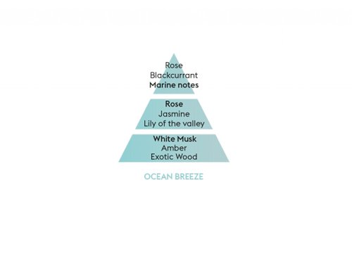Náplň do difuzéra do auta, ktorý je možné ľahko pripevniť pomocou plastového klipu na prieduchy klimatizácie. Intenzita vône je vyznačená na obale číslom 1–5. Nespútanosť morských vĺn i pohladenie od kvapiek vody nesúcich sa od mora prináša interiérový parfém Vôňa oceánu. V počiatočných notách ucítite vôňu ruží a čiernych ríbezlí na morskom pobreží. Kvetinové srdce vám potom postupne odhalí kyticu radostných vôní jazmínu, konvaliniek a ruží. Základ parfumu potom tvorí biele pižmo, ambra a vôňa exotického dreva . Zloženie vône: hlava: ruža, čierne ríbezle, morské tóny, srdce: ruža, jazmín, konvalinka, základ: biele pižmo, ambra, exotické drevo.