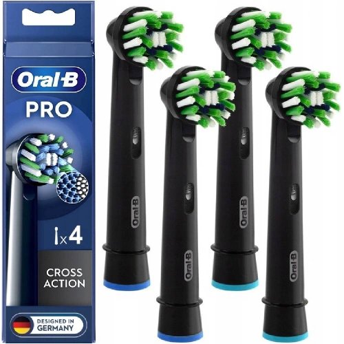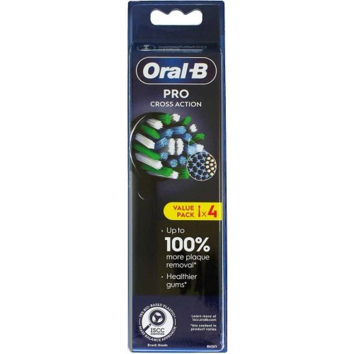 Kefková hlava Oral-B Pro Cross Action v čiernej farbe má viac ako 2200 dokonale skosených vlákien, ktoré v porovnaní s manuálnou zubnou kefkou odstraňujú až o 100% viac bakteriálneho zubného povlaku a zaisťujú čistejšie zuby a zdravšie ďasná. Originálne kefkové hlavy Oral-B sú navrhnuté s novými vláknami v tvare X, ktoré čistia v miestach, kam okrúhle hlavy nedosiahnu. Ukazovateľ opotrebenia kefkovej hlavy zmení vlákna zo zelenej farby na žltú a ukazuje tak, kedy je hlavu nutné vymeniť pre 100% účinnosť čistenia. Zaručená kompatibilita so všetkými dobíjacími zubnými kefkami Oral-B, s výnimkou zubných kefiek Pulsonic a iO.