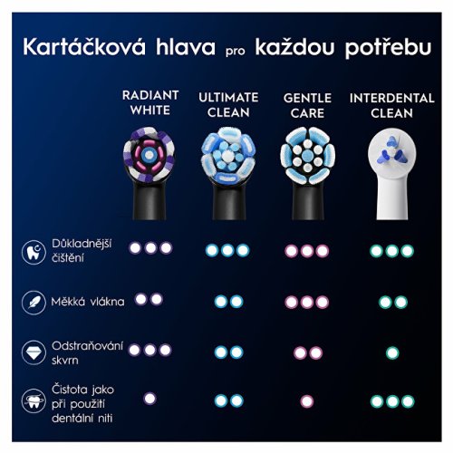 Náhradné kefkové hlavice vyvinuté na každodenné bielenie zubov. Vďaka kombinácii precízne skosených vlákien a leštiacich plátkov jemne, ale účinne odstraňujú povrchové škvrny od kávy, čaju alebo jedla a zanechávajú zuby žiarivo čisté a belšie. Dizajn okrúhle hlavice inšpirovaný nástrojmi zubných lekárov spolu s technológiou mikrovibrácií prináša profesionálny výsledok z pohodlia domova. Hlavice sú určené výhradne pre elektrické kefky Oral-B iO Series.