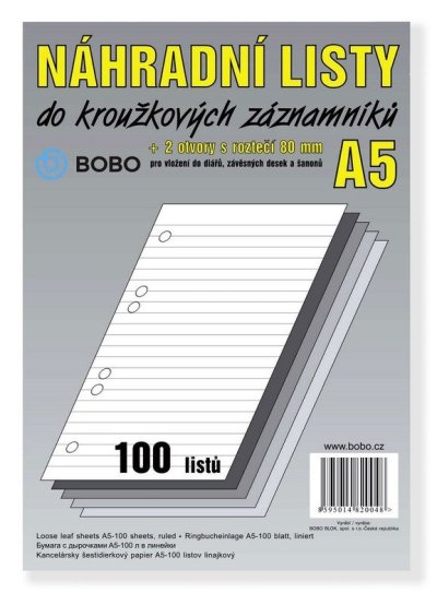 Náhradné listy formát A5, 100 listov. br brSada náhradných linkovaných listov do krúžkových záznamníkov. Súprava obsahuje 100 listov linkovaného bezdrevného papiera formátu A5, ktorý je opatrený 6 dierami pre vloženie do krúžkovej mechaniky.