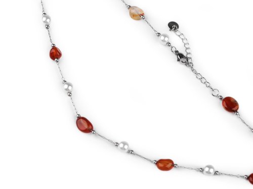 Jemný retiazkový náhrdelník z kvalitnej nerezovej ocele je ozdobený farebnými korálkami syntetických minerálov a perlami. Korálky majú pôsobivé priesvity, jedná sa o vydarenú kópiu pravých minerálov. Náhrdelník sa hodí k slávnostným šatám aj na bežné nosenie, má veľmi všestranné využitie. Zapína sa na karabínku a predlžovaciu retiazku. Upozorňujeme zákazníkov, že farby aj tvar korálikov sa môže líšiť.