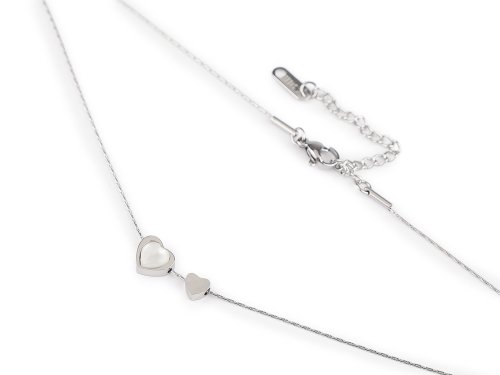 Náhrdelník s ozdobou srdiečka je vyrobený z kvalitnej nerezovej ocele. Je veľmi decentný, motív srdiečka poteší všetky ženy. Je aj nádherným darčekom pre blízku osobu alebo na Valentína. Náhrdelník č. 1 má hranatá hadia retiazka široký 1 mm, srdiečko je ozdobené pútavou imitáciou perlete. Je veľké 10 x 11 mm, na náhrdelníku sa voľne pohybuje, ale nejde zložiť. Náhrdelník č. 2 a 3 má jemnú retiazku z hranatých očiek široký 0,6 mm, väčšie srdiečko (8x8 mm) je ozdobené efektom mačacieho oka, malé srdiečko (5x5 mm) má vysoký zrkadlový lesk. Obe srdiečka sa na retiazke voľne pohybujú, z náhrdelníka nejdú zložiť. Náhrdelníky sa zapínajú na karabínku s predlžovacou retiazkou.