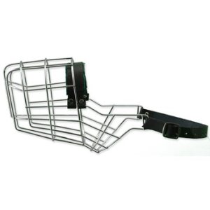 Kovový náhubok s koženými remienkami na zapínanie.