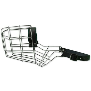 Kovový náhubok s koženými remienkami na zapínanie.