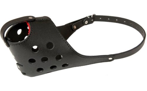 Kožený čierny náhubok pre psa, spoje sú upevnené kovovými nitmi. Ideálne pre použitie vo verejnej doprave a všade tam, kde psík musí mať náhubok.